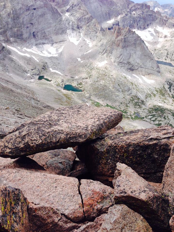 The final push up into the Keyhole revealed a flat ledge, something like a balcony of rock, where I could stand and take photos. To summit Longs, you climb through the Keyhole to the other side and snake your way up the other side of the mountain. I was now standing on that balcony, alone, facing snow capped mountain peaks in every direction and alpine lakes resting 2000 feet below at the bases. The views of Powell Peak, McHenry Peak, Glacier Gorge and Black Lake were outstanding. I was humbled, and a little nauseous. 1000+ feet of drop without a guardrail was like nothing I had ever experienced. To think that this type of beauty exists in this world, and we were climbing on it for fun. I inhaled the mountain air and exhaled tears, the last four years of heartache and uncertainty spilling out onto the rock. In that moment, the fullness of God and the Universe penetrated my soul in a way I had never experienced in a church pew or on my knees in prayer. The mountain was my church and my soul was singing. “Thank you”, I said in a whimper, the wind lifting my words up past the peaks and to the heavens.